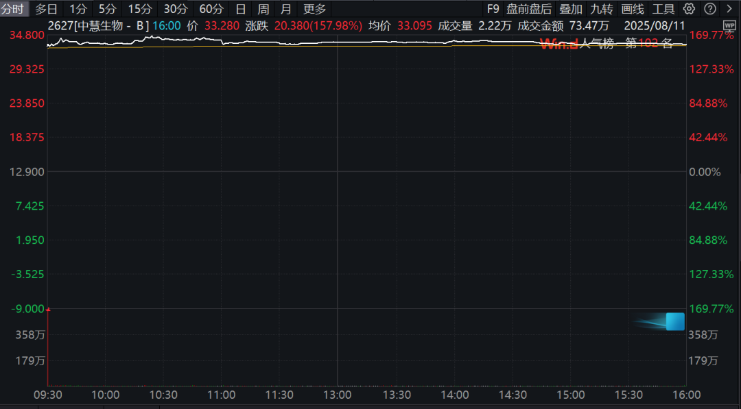 又见新股暴涨。今日早盘,中慧生物-B上市首日一度涨逾169.7%。