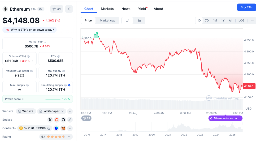 与此同时至德投资,比特币价格日内一度回落3%,至113,000美元下方。以太坊一度下跌超过5%,跌至4100美元左右。